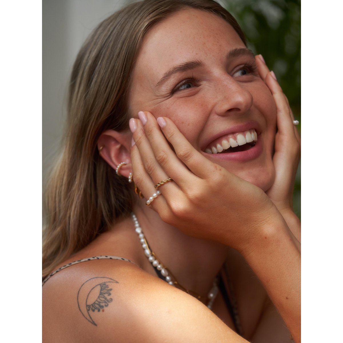 Our pieces are hypoallergenic, won't tarnish, and won't leave green marks on your skin. You can confidently wear them while showering, swimming, or working out — the color stays vibrant and shiny, even longer than sterling silver.
